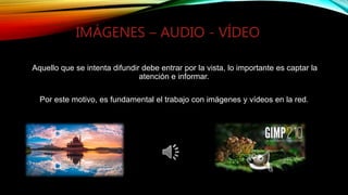 El documento habla sobre el uso de multimedia en la web, incluyendo imágenes, audio y video. Explica que las imágenes pueden ser rasterizadas o vectoriales, y que la calidad se define por la profundidad de color y compresión. También cubre cómo editar y publicar imágenes y álbumes en sitios como Flickr y Picasa. Describe los formatos de audio digitales y parámetros como la frecuencia de muestreo y bits de muestreo. Finalmente, define características clave de video digital como la resolución y tasa de bits.