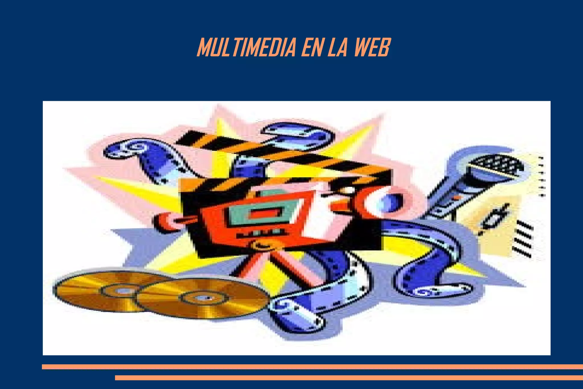 Este documento describe los diferentes tipos de multimedia digital como imágenes, audio y video. Explica que las imágenes pueden ser vectoriales o de mapa de bits, y los principales formatos de archivo como JPG, GIF y PNG. También describe los parámetros del audio digital como la frecuencia de muestreo y los canales, y los formatos como WAV, MP3 y OGG. Finalmente, cubre las características del video digital como la resolución y tasas de bits, y los formatos como AVI, MP4 y FLV.