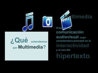 El documento describe los principios básicos de la multimedia, incluyendo que es un producto de comunicación audiovisual interactivo que usa hipertexto. La multimedia permite combinar textos, gráficos, video y audio de manera flexible para crear un mensaje de alto impacto. Un producto multimedia debe evitar el aburrimiento, enfocarse en escenas interesantes y permitir múltiples formas de entrada para el usuario.