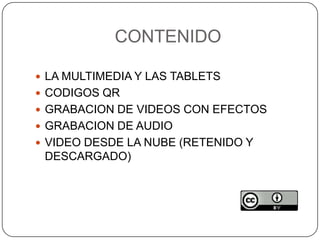Este documento describe las diferentes aplicaciones multimedia que pueden crearse y utilizarse con tabletas, incluyendo la grabación de videos y audio con efectos, la visualización y descarga de videos desde la nube, y la creación de códigos QR. También explica que los códigos QR permiten almacenar grandes cantidades de información alfanumérica en un formato de código de barras bidimensional y que pueden usarse para publicidad, marketing, diseño gráfico y más. Además, proporciona información sobre cómo generar y leer códigos QR us