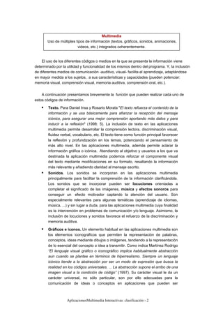 Este documento clasifica las aplicaciones multimedia interactivas en tres categorías: 1) Sistema de navegación (lineal, reticulada, jerarquizada), 2) Finalidad y base teórica (informativas como libros multimedia vs formativas como tutoriales), y 3) Nivel de control del profesional. Describe los diferentes tipos de medios (texto, sonido, gráficos, imágenes) y cómo proporcionan interactividad e información de manera efectiva para la educación.