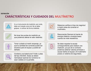 Un multímetro es un instrumento que se usa para medir magnitudes eléctricas como voltaje, corriente y resistencia en circuitos eléctricos y electrónicos. Puede medir voltaje continuo y alterno, corriente continua y alterna, y resistencia. Contiene selectores y pantallas para indicar las diferentes mediciones.