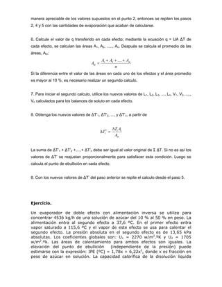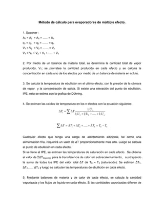 Este documento describe un método de cálculo para evaporadores de múltiple efecto. 1) Se asumen condiciones iguales en cada efecto. 2) Se determina la cantidad total de vapor producido mediante balances de materia y se distribuye entre los efectos. 3) Se calculan las temperaturas de ebullición en cada efecto. 4) Se estiman las caídas de temperatura entre efectos. 5) Se calculan los flujos mediante balances de materia y calor. 6) Se calculan las áreas requeridas.