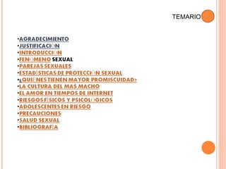 El documento habla sobre la educación sexual de los adolescentes en México. Señala que el 17% de los embarazos son en mujeres menores de 20 años y solo el 70% de mujeres usan anticonceptivos. Explica que esto se debe a iniciar la actividad sexual temprano, falta de servicios para adolescentes y desconocimiento de educación sexual. También presenta estadísticas sobre el número promedio de parejas sexuales de mexicanos y estadounidenses. Resalta los riesgos físicos y psicológicos para adolescentes y recomienda vacun