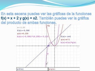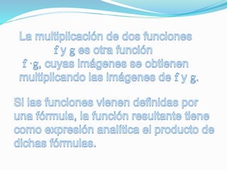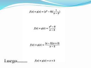 Este documento presenta una lista de cuatro nombres y una función matemática. La función f(x) se multiplica por la función g(x), donde f(x) es igual a (x2 - 9) / (x - 3) y g(x) es igual a 1. Luego se calcula la derivada de f(x) por g(x).