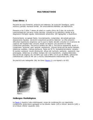 Este documento presenta dos casos clínicos de niños con neumonía. El primer caso es de una niña de 2 años con neumonía viral y bacteriana mixta que requirió ventilación mecánica. El segundo caso es de un niño de 1 año con neumonía bacteriana causada por Haemophilus influenzae tipo b. Ambos pacientes tuvieron una buena recuperación después del tratamiento antibiótico adecuado.