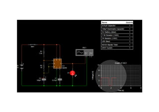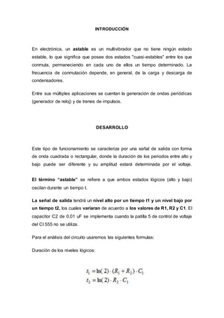Este documento describe un circuito multivibrador astable utilizando un integrado 555. Un multivibrador astable genera una señal de salida cuadrada con dos estados cuasi-estables entre los que conmuta durante tiempos determinados por los componentes del circuito. El documento explica el funcionamiento, las fórmulas para calcular los tiempos de cada estado y los componentes necesarios, e incluye los resultados experimentales de un circuito que enciende un LED aproximadamente 1 segundo y lo apaga 0.5 segundos de forma continua.