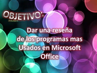 Este documento proporciona una reseña de los principales programas de Microsoft Office como Word, Excel y PowerPoint. También explica conceptos básicos de color como tono, brillo y saturación. Word es para procesamiento de textos, Excel para hojas de cálculo y PowerPoint para presentaciones con texto e imágenes. El tono se refiere al color en sí, el brillo a la claridad u oscuridad y la saturación a la pureza del color.