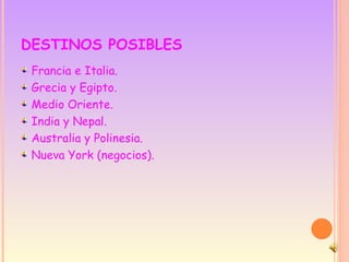 El documento presenta varios destinos turísticos populares en Europa como Francia, Italia, y Grecia, así como otros destinos alrededor del mundo como India, Australia y Nueva York. Se proporciona información detallada sobre Francia e Italia, incluyendo atracciones principales y hoteles recomendados en Roma, Venecia, Milán y Nápoles con sus respectivos precios.
