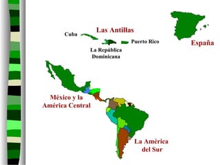 El documento lista los países de habla hispana de México y América Central, América del Sur, España, Cuba, Puerto Rico y la República Dominicana. También incluye las capitales de estos países y territorios y los gentilicios correspondientes a cada uno.