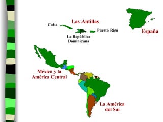 El documento lista países y territorios hispanohablantes incluyendo Cuba, República Dominicana, Puerto Rico, México y América Central, América del Sur y España. Detalla las capitales y gentilicios de cada lugar mencionado.