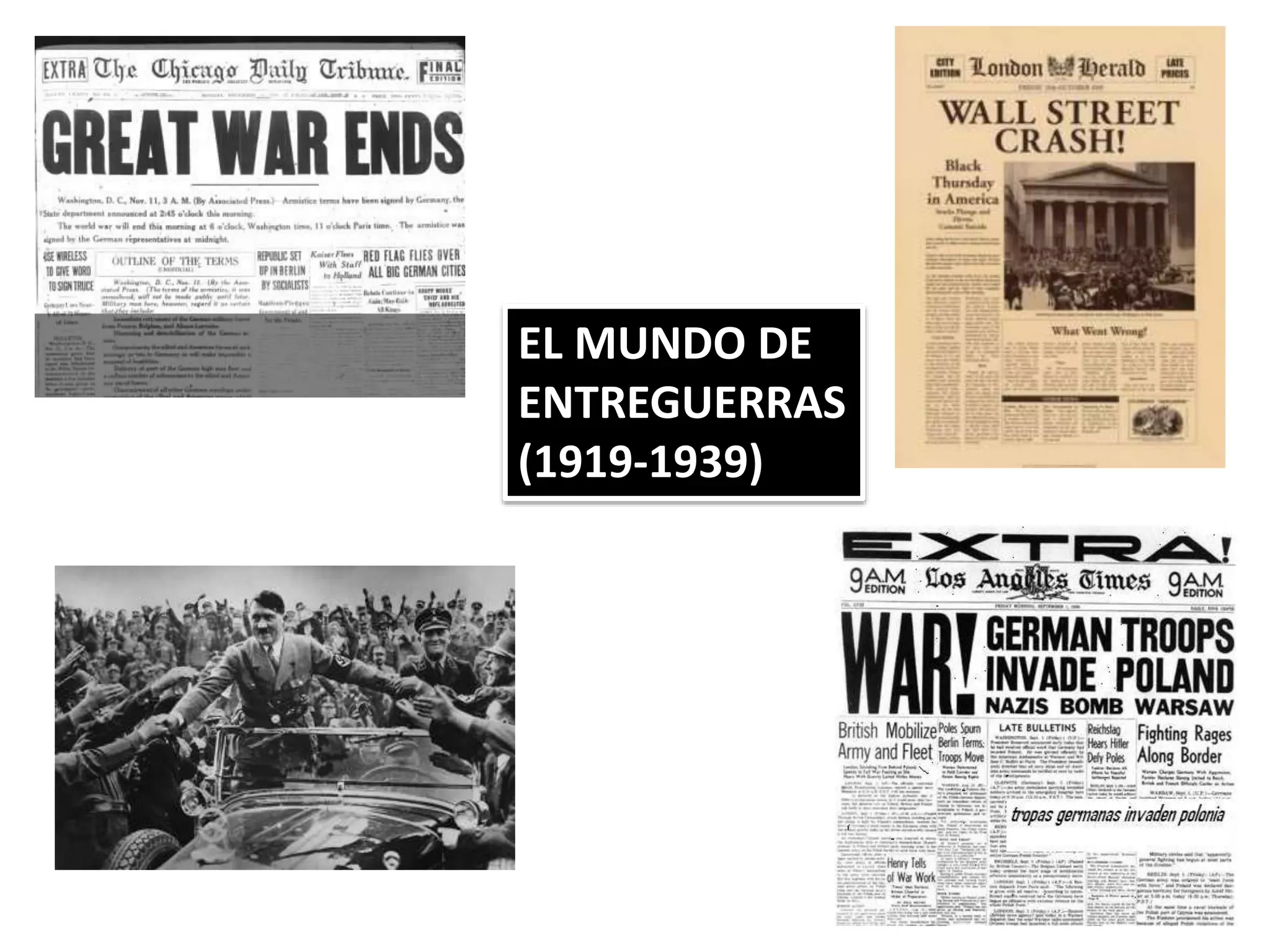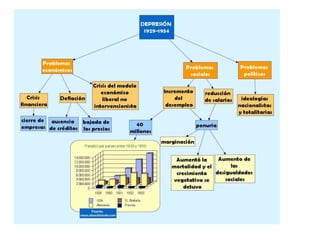 El documento resume el período de entreguerras (1919-1939). Hubo dos crisis económicas brutales, la posguerra y el Crack de 1929 que condujo a la Gran Depresión. Se consolidó la Unión Soviética como el primer estado comunista y surgieron nuevos estados fascistas como Italia y Alemania. Europa experimentó hostilidad entre las naciones hasta acuerdos de mediados de los años 20, pero la crisis de 1929 condujo a nuevos virajes hacia la guerra.