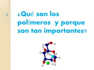 1) Los polímeros son macromoléculas compuestas por la repetición de unidades monoméricas a lo largo de una cadena. Son importantes debido a la variedad de usos que tienen en alimentos, textiles y otros materiales.