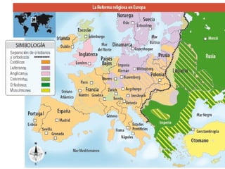 El documento resume los principales acontecimientos que marcaron el final de la Edad Media e inicio de la Edad Moderna, como la caída de Constantinopla en 1453, la invención de la imprenta en 1456, el descubrimiento de América en 1492 y la Reforma Protestante iniciada por Lutero en 1517. Estos eventos, junto con el florecimiento de las artes en Italia, determinaron el paso de la Edad Media a un nuevo periodo histórico.