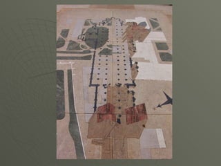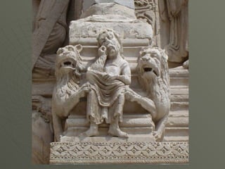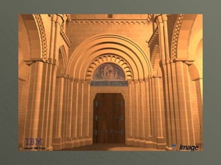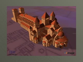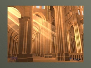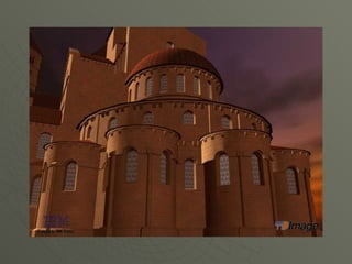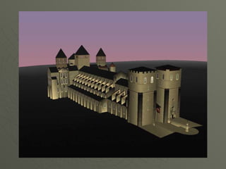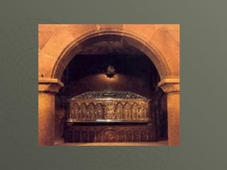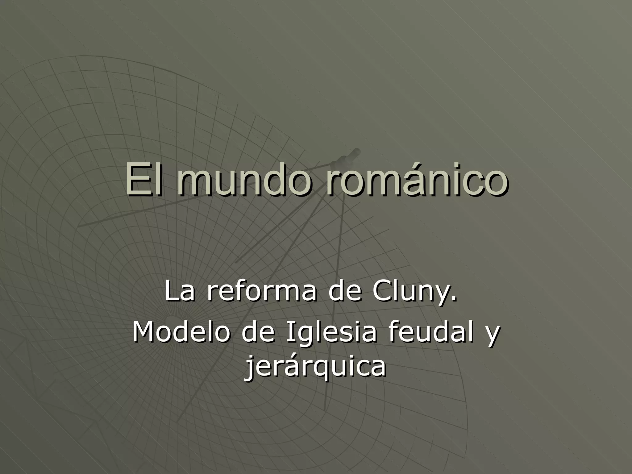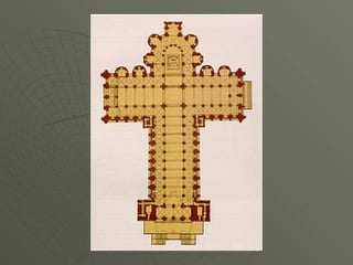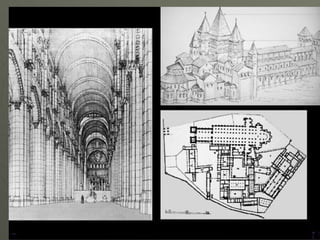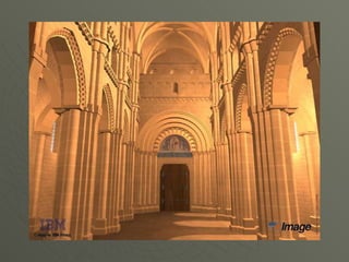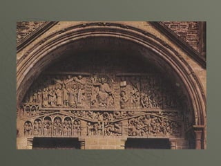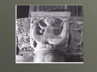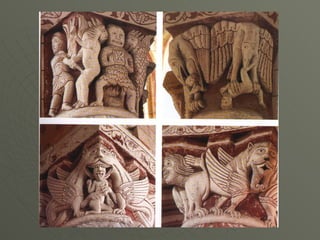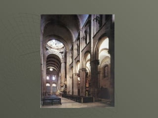 El documento describe el arte románico en Europa, con un enfoque en las iglesias, monasterios y castillos construidos entre los siglos XI y XIII. Explica las tipologías arquitectónicas principales, los estilos nacionales en países como Italia, Alemania e Inglaterra, y destaca el significado religioso y cultural de las peregrinaciones a Santiago de Compostela.