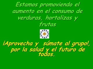 Este documento presenta información nutricional sobre verduras, hortalizas y frutas. Explica cómo clasificar estos alimentos según su contenido de hidratos de carbono e incluye tablas detallando los nutrientes presentes en cada uno. El objetivo es promover un mayor consumo de estos alimentos por sus beneficios para la salud.