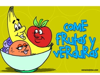El documento presenta información sobre las verduras, hortalizas y frutas, incluyendo su clasificación según el contenido de hidratos de carbono y los nutrientes que aportan. Se anima al consumo de estos alimentos por sus beneficios para la salud. Explica que contienen fibras, vitaminas y minerales importantes para el organismo.
