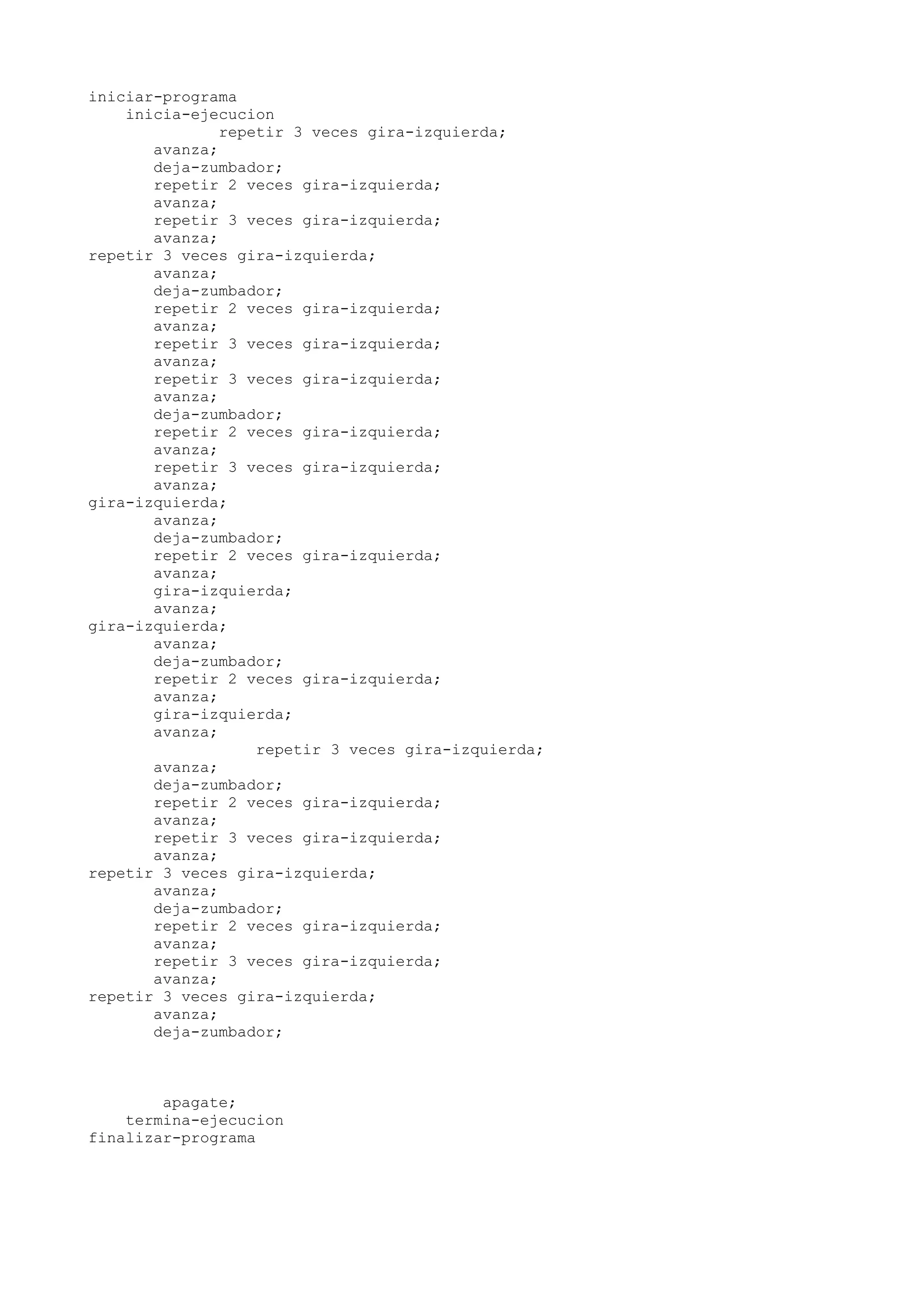 El documento describe una secuencia de instrucciones para un dispositivo que gira a la izquierda múltiples veces, avanza, suena una alarma y repite la secuencia varias veces antes de apagarse.