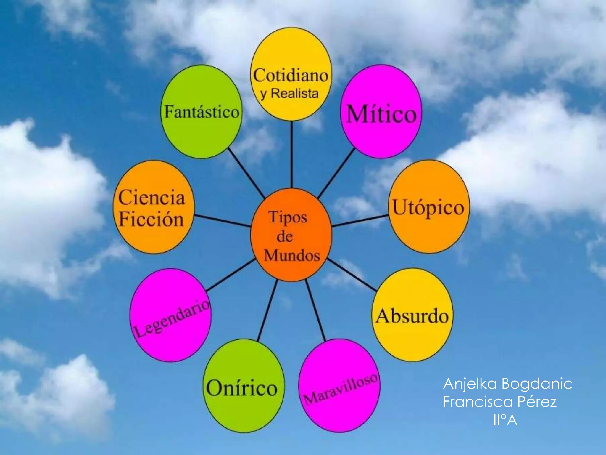El documento describe diferentes tipos de mundos representados en la literatura, incluyendo el mundo cotidiano, realista, utópico, fantástico, onírico, maravilloso, absurdo, ciencia ficción, legendario y mítico. Proporciona definiciones y ejemplos breves de cada uno.