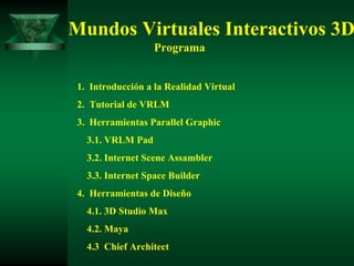 Este documento presenta un taller sobre mundos virtuales interactivos 3D. El programa incluye introducciones a la realidad virtual, herramientas de Parallel Graphic como VRML Pad, Internet Scene Assambler e Internet Space Builder, y herramientas de diseño 3D como 3D Studio Max, Maya y Chief Architect. El taller explicará conceptos como realidad virtual, VRML y sus aplicaciones, y cómo diseñar y desarrollar mundos virtuales 3D interactivos.