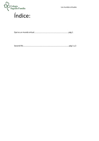 Según el documento, un mundo virtual como Second Life es un entorno virtual 3D donde los usuarios interactúan a través de avatares. Second Life les permite a los usuarios personalizar sus avatares, explorar el mundo virtual, establecer relaciones sociales y económicas, y crear y comerciar propiedades virtuales. En el futuro, es posible que las personas pasen más tiempo en mundos virtuales debido al trabajo y ocio, y que sus vidas en el mundo real se vuelvan ocasionales.