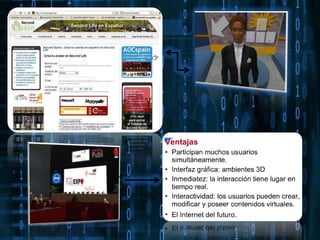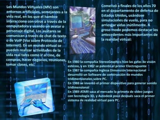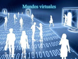 Los mundos virtuales comenzaron a desarrollarse a finales de los 70s por el departamento de defensa de EE.UU. para simulaciones de vuelo. A lo largo de los 80s y 90s se desarrollaron diversas tecnologías como gafas de realidad virtual, guantes electrónicos y software 3D que permitieron la creación de mundos virtuales. En la actualidad, mundos virtuales como Second Life permiten a usuarios interactuar a través de avatares y realizar diversas actividades en entornos 3D simulados al mundo real.