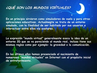 Este documento describe los mundos virtuales, sus características y algunos ejemplos de cómo se utilizan para la educación. Los mundos virtuales son entornos simulados online donde los usuarios interactúan a través de avatares. Se usan para enseñar vocabulario de forma interactiva, crear aulas virtuales compartidas y permitir que los estudiantes interactúen entre sí de manera realista. También se usan para que niños hospitalizados se comuniquen y jueguen online.