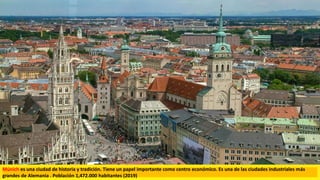 Múnich es una importante ciudad industrial y centro económico en Alemania, conocida por su rica historia, arquitectura y cerveza. Algunos de sus principales puntos de interés incluyen la plaza Marienplatz, la Catedral de Nuestra Señora, la Residencia Real, el Palacio de Nymphenburg y el Parque Olímpico. Múnich también es reconocida por ser sede de importantes empresas como BMW y por albergar eventos deportivos de talla mundial.