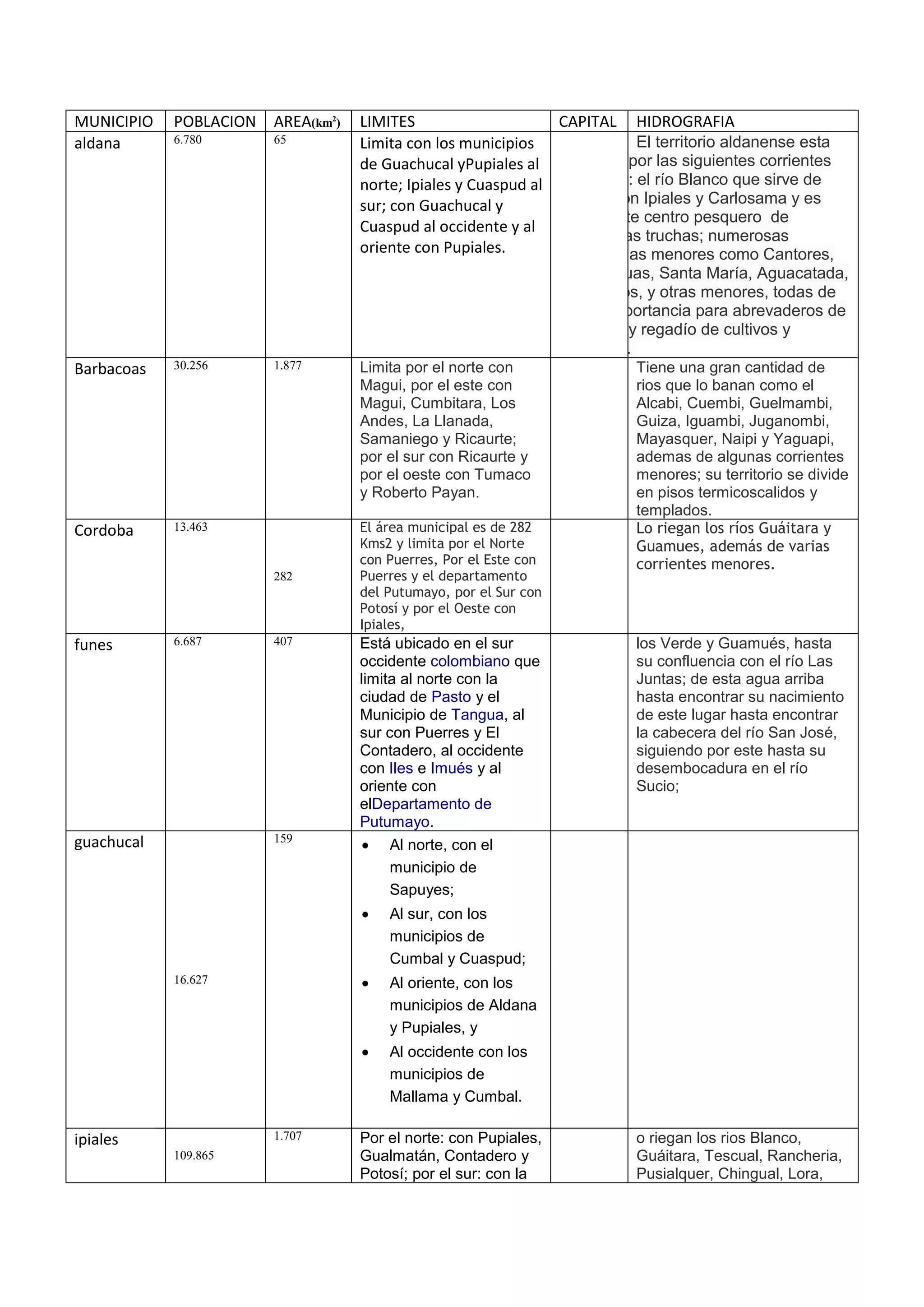 Este documento presenta información sobre los límites territoriales, población, área y principales ríos y quebradas de 20 municipios de Colombia. Cada municipio se describe brevemente con su población, área en km2 y los límites político-administrativos y cursos de agua que lo atraviesan o delimitan. Los municipios se extienden por los departamentos de Nariño, Cauca y Norte de Santander.