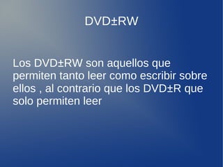 Los DVD±RW permiten tanto la lectura como la escritura de datos, a diferencia de los DVD±R que solo permiten la lectura. Existen dos formatos principales, DVD+RW y DVD-RW, que difieren principalmente en que el DVD+RW requiere de un proceso de inicialización y finalización para la grabación, mientras que el DVD-RW no requiere de estos procesos y permite detener y reanudar fácilmente la grabación.
