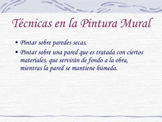 La pintura mural es la forma más antigua de pintura, data de las antiguas civilizaciones de Egipto, Grecia y Roma, donde se pintaban murales en pirámides, templos y palacios. Durante la Edad Media y el Renacimiento, la pintura mural se extendió a iglesias y mansiones. En México surgió un importante movimiento muralista en el siglo XX liderado por artistas como Diego Rivera, José Clemente Orozco y David Alfaro Siqueiros, quienes crearon grandes obras murales en edific