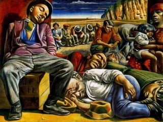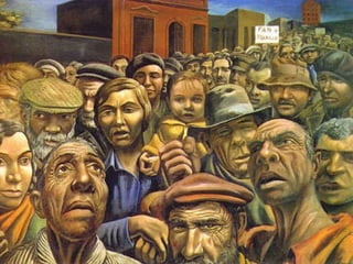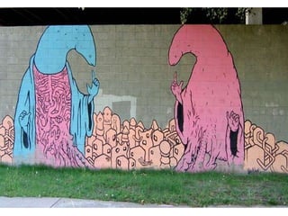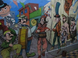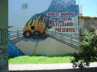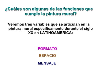 Este documento describe tres funciones clave de la pintura mural en Latinoamérica durante el siglo XX: 1) Su gran formato e instalación en espacios públicos hace que las imágenes sean impuestas al espectador, 2) Transmiten ideas relacionadas con las necesidades de las clases sociales a través de la intervención del espacio público, y 3) Sus mensajes deben ser comprensibles para personas de diferentes culturas y clases sociales.