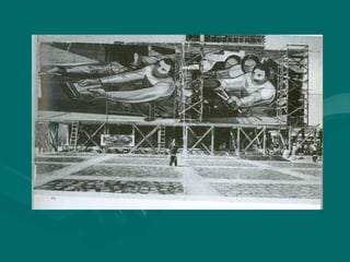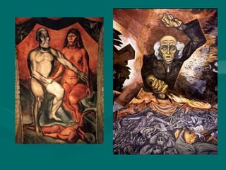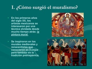 El documento describe el surgimiento del muralismo mexicano entre 1910 y 1922 como un movimiento artístico inspirado en la Revolución Mexicana con el objetivo de crear un arte público comprometido con las luchas sociales. Los tres grandes muralistas fueron Diego Rivera, José Clemente Orozco y David Alfaro Siqueiros, quienes pintaron murales con temas como la justicia laboral y la cultura indígena utilizando técnicas como el fresco.