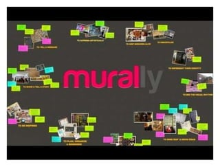 El documento describe los murales virtuales, herramientas de la Web 2.0 que permiten compartir recursos como documentos, imágenes y videos en tablones virtuales. Se utilizan en educación para el trabajo colaborativo entre grupos. Algunas aplicaciones populares son Lino, Padlet, Murally y Glogster. Mural.ly es otra herramienta gratuita que permite crear pósters colaborativos integrando contenido multimedia. Los murales virtuales favorecen la interacción entre docentes y alumnos y promueven el trabajo colabor