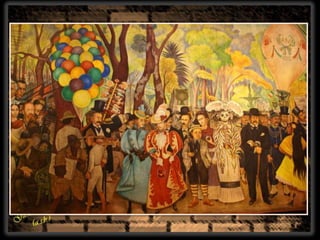 Diego Rivera fue un destacado pintor mexicano conocido por sus grandes murales al fresco que ayudaron a establecer el Movimiento Mural Mexicano. Entre 1922 y 1953, Rivera pintó murales en varias ciudades de México y Estados Unidos, incluyendo la Ciudad de México, Nueva York y San Francisco. En 1931, el Museo de Arte Moderno de Nueva York celebró una retrospectiva de su obra.