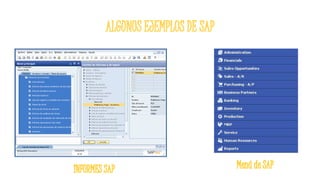 Este documento describe el software SAP y sus diferentes módulos. SAP es una empresa alemana que diseña productos de gestión empresarial para empresas y organizaciones. Incluye módulos como SAP Business One para PYMES, SAP CRM para gestión de clientes, SAP ERP para planificación de recursos, SAP PLM para gestión de ciclo de vida de productos, SAP SCM para gestión de cadena de suministro, y SAP SRM para gestión de proveedores. El software SAP permite administrar de manera integral funciones financieras, de fabric