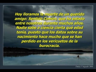 El documento resume la muerte de Sentido Común. Señala que su salud se deterioró cuando se aplicaron reglas ineficaces que llevaron a situaciones como un niño de 6 años acusado de abuso sexual por dar un beso o una maestra despedida por reprender a un alumno. Sentido Común perdió terreno cuando los padres atacaron a los maestros y las escuelas requirieron permisos para todo. Su muerte se debió a que conceptos como los Diez Mandamientos se volvieron risibles y las víctimas rec