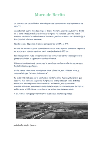 Tras la Segunda Guerra Mundial, Berlín se dividió en cuatro zonas de ocupación controladas por la Unión Soviética, Estados Unidos, Reino Unido y Francia. Esto llevó a la creación de dos Alemanias: la República Democrática Alemana (RDA) en el este controlado por los soviéticos, y la República Federal Alemana (RFA) en el oeste controlado por los aliados. En 1961, la RDA construyó el Muro de Berlín para detener la fuga masiva de personas hacia el sector capitalista de la