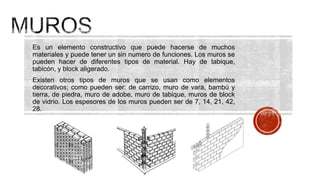 1) Los muros son elementos constructivos que soportan cargas y dividen espacios, pudiendo hacerse de diversos materiales como tabique, bloque o adobe.