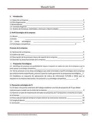 Este documento presenta propuestas tecnológicas para mejorar los procesos y el servicio de la empresa de comida japonesa Musashi Sushi. Se analizan los procesos clave de la empresa como compras, ventas y servicios, y se propone implementar un sistema de información que mejore la eficiencia en la elaboración de productos, el control de ventas y el trato al cliente. El documento también incluye un análisis DOFA de la empresa y establece su misión, visión y estrategias competitivas.