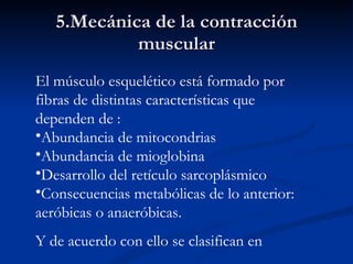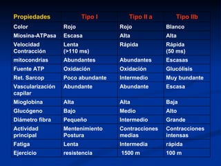 El documento describe las características de los diferentes tipos de fibras musculares esqueléticas. Las fibras se clasifican en tipo I, tipo IIA y tipo IIB dependiendo de su color, velocidad de contracción, fuente de ATP y otras propiedades. El tipo de fibras predominantes en un músculo determina si es más adecuado para resistencia o velocidad. Además, se explican los tipos de contracciones musculares y cómo se mide la fuerza muscular.
