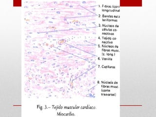 Las células musculares tienen un metabolismo activo que requiere nutrientes y oxígeno. Los capilares proveen estas sustancias entre las células musculares. Las células ejercen tracción sobre el tejido conectivo fibroso. La unidad estructural y funcional de las fibras musculares estriadas es la sarcomera, compuesta por bandas claras e oscuras. La contracción muscular se produce por el deslizamiento de las fibras delgadas de actina sobre las gruesas de miosina.