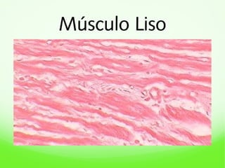 El músculo liso se encuentra en las paredes de órganos huecos como el aparato digestivo, circulatorio, respiratorio y urogenital. Carece de estrías y se contrae de forma involuntaria mediante estímulos del sistema nervioso autónomo para generar presión dentro de los órganos. Está formado por células fusiformes con filamentos de actina y miosina que se unen durante la contracción muscular sin la presencia de sarcomeros.