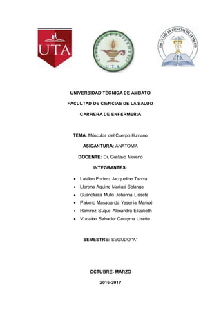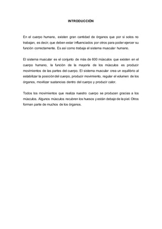Este documento presenta una descripción detallada de los músculos de la cara y el cuello. Describe la estructura, inserción, inervación y función de cada músculo individual. El objetivo es identificar los músculos, diferenciar sus estructuras y entender cómo trabajan en conjunto para permitir el movimiento y funciones del cuerpo. Se proporciona información anatómica fundamental sobre los sistemas muscular y esquelético.