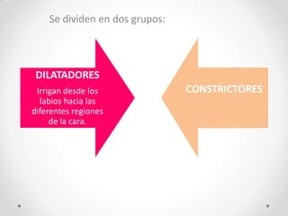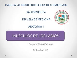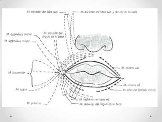 El documento detalla la anatomía de los músculos de los labios, clasificándolos en dilatadores y constrictores, y describe su origen, inserción y función en la movilidad facial. Se mencionan músculos específicos como el buccinador, depreso del labio inferior, elevador del labio superior y del ala de la nariz, entre otros, y su impacto en acciones como la masticación y la expresión facial. También se incluye información sobre el desarrollo de ciertos músculos en recién nacidos y sus roles en la seducción y otros gestos faciales.