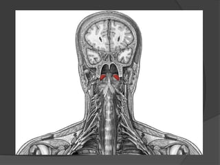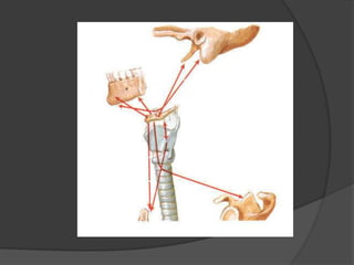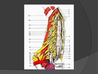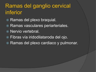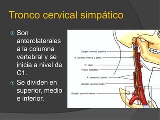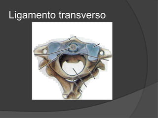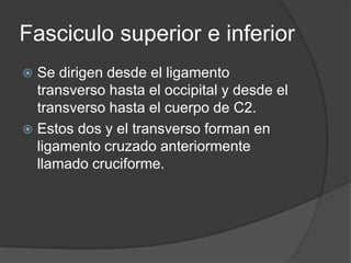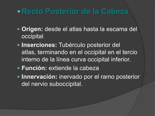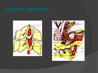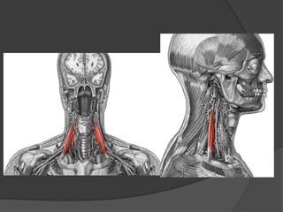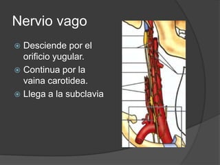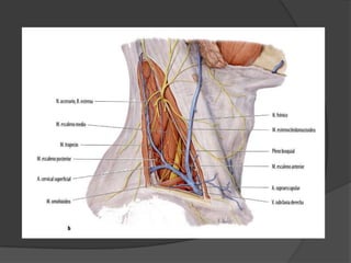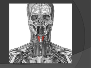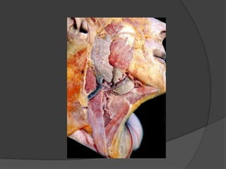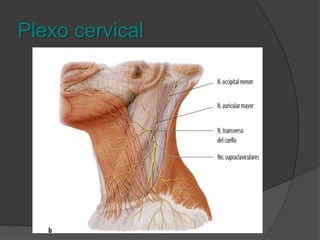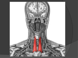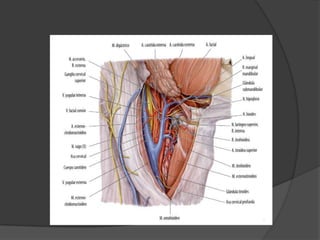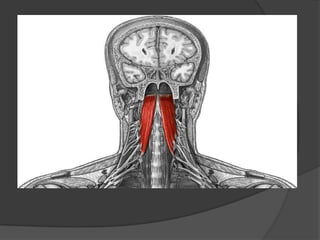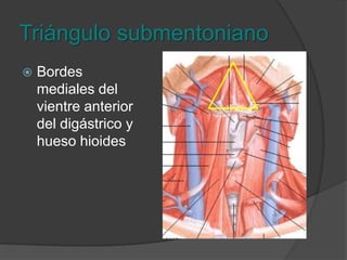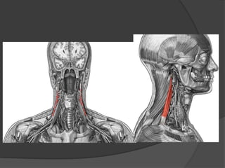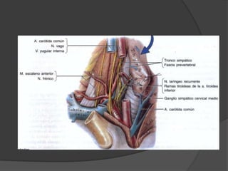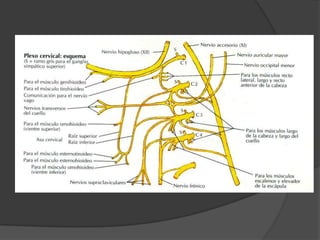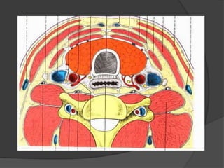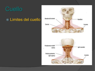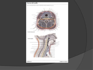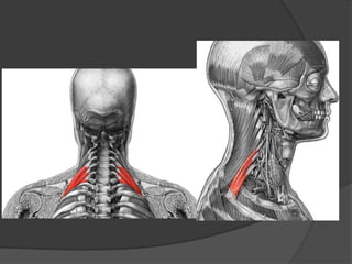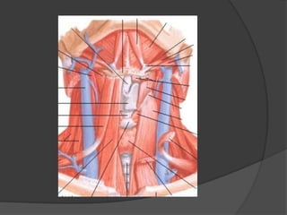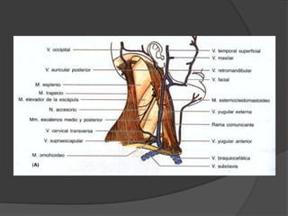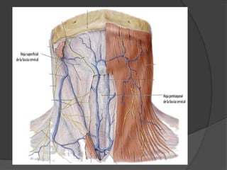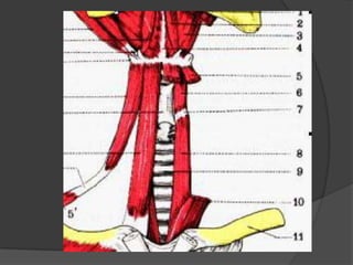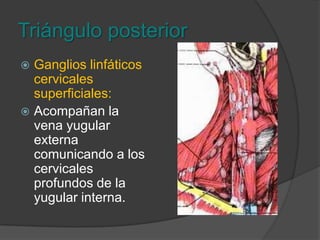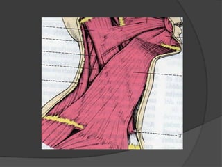 El documento describe los músculos, ligamentos y vasos sanguíneos del cuello. Menciona los músculos platisma, esternocleidomastoideo, escalenos y otros músculos prevertebrales, infra e suprahioideos. También describe los triángulos del cuello incluyendo el triángulo posterior formado por el esternocleidomastoideo y trapecio, y contiene la arteria subclavia y venas yugular externa y cervical transversa.