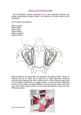 Este documento describe los músculos extraoculares, sus funciones y movimientos oculares. Explica que hay 6 músculos que rodean el globo ocular: 4 rectos y 2 oblicuos. Cada músculo tiene una acción primaria y secundarias. Los músculos trabajan juntos como agonistas y sinergistas para producir los movimientos oculares en los ejes vertical, horizontal y anteroposterior.