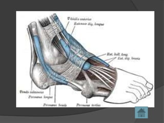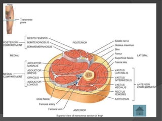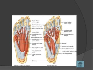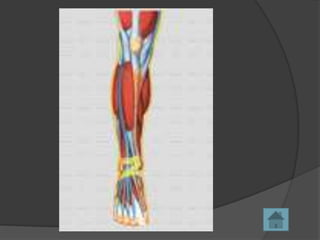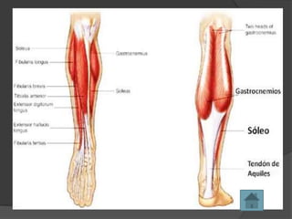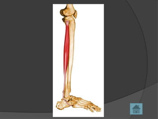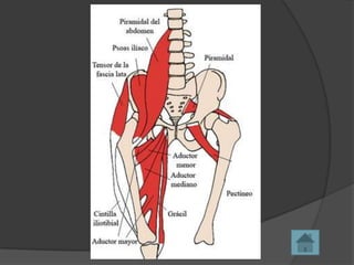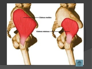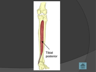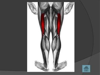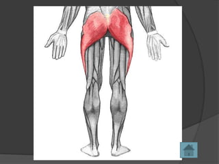 Este documento resume los principales grupos musculares de los miembros inferiores, describiendo el origen, inserción, acción e inervación de los músculos. Los músculos se dividen en aquellos que mueven el fémur, la tibia y peroné, el pie y los dedos, e intrínsecos del pie. Se describen detalles de varios músculos clave en cada grupo, incluyendo el cuádriceps femoral, glúteos, sóleo y flexores plantares.