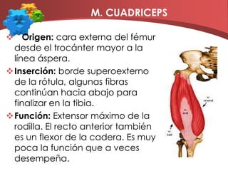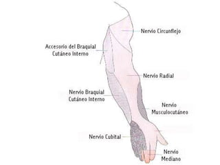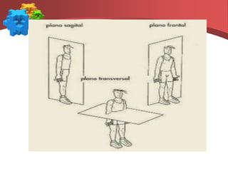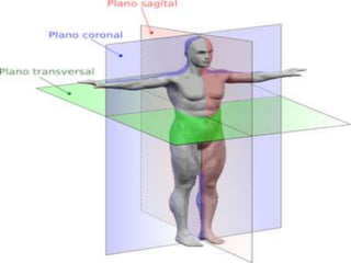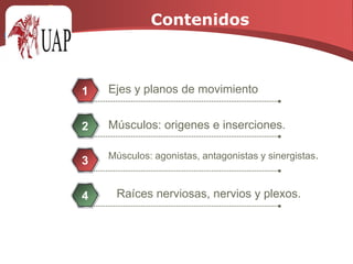 Este documento describe la anatomía humana, incluyendo los ejes y planos de movimiento, los músculos principales con sus orígenes e inserciones, y los nervios y plexos. Se detalla la función de músculos como el frontal, temporal, deltoides y cuádriceps. También explica conceptos como agonistas, antagonistas y sinergistas y describe plexos como el braquial formado por las raíces C5-C8 y D1.