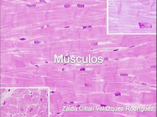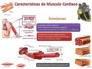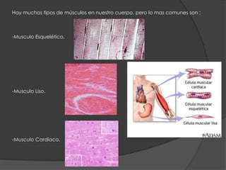 El documento describe los tres tipos principales de músculos en el cuerpo humano: músculo esquelético, músculo liso y músculo cardiaco. El músculo esquelético está formado por fibras musculares estriadas multinucleadas, el músculo liso por fibras musculares lisas uninucleadas, y el músculo cardiaco por cardiomiocitos que forman la pared del corazón.